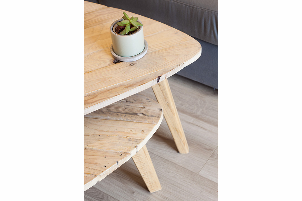 Des tables basses design inspirées des années 50. Entièrement en bois de palettes récupérées. Deux tailles différentes pour l'utilisation en gigogne. 100% bois de palettes!